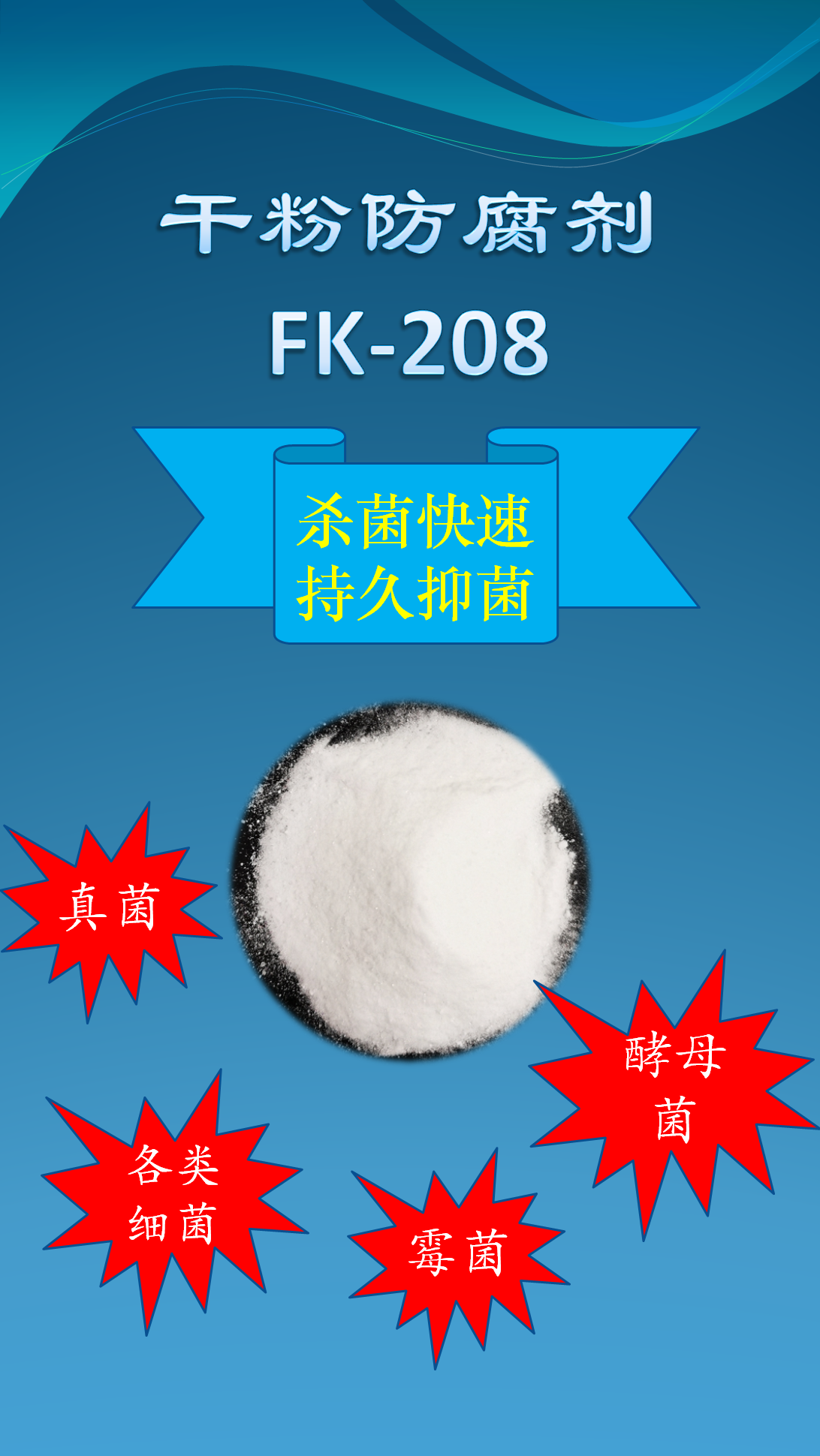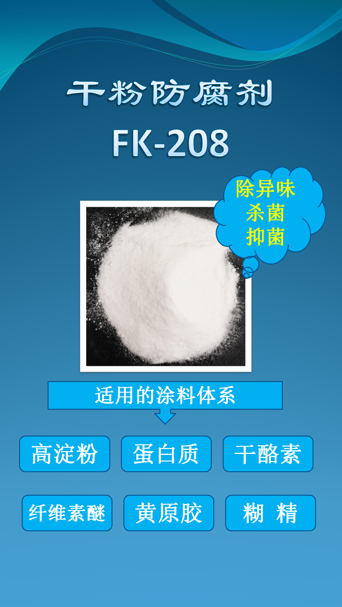 一般使用量在 0.1-0.2%(重量比),添加量具体取决于产品是否容易受微生物侵蚀和产品的贮存环境。如果已经腐败的体系,可以在腐败的浆料中添加0.2-0.3%的FK-208,经过充分搅拌分散(或先溶解于水,再加入)后,可以有效除去异味,并保存较长时间不再腐败。
