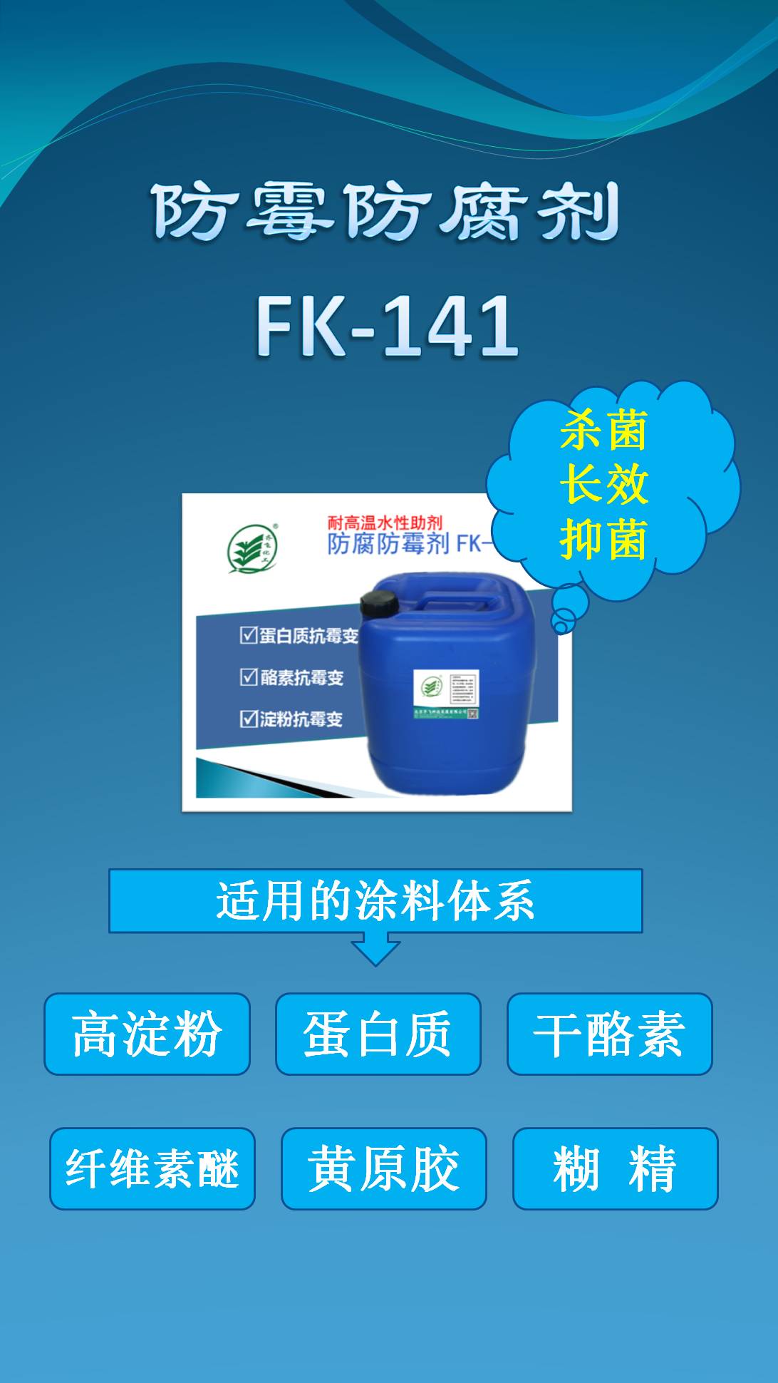 FK141 属于耐高温、耐酸碱防腐防霉剂。该产品不含甲醛也不释放甲醛,化学稳定性出色,并与大多数工业产品配方具有良好的相容性,可有效防止有害细菌、真菌或其他霉腐微生物对水性体系的侵蚀。该杀菌剂尤其适用于高温环境和碱性水系、持久防止腐败和恶臭气味的产生。
